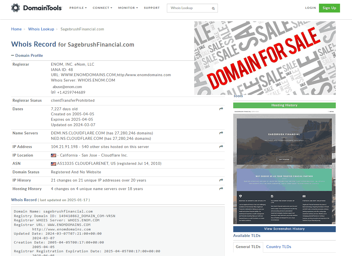 As of March 2024, the domain remains actively registered with safeguards against unauthorized transfers, as shown by its clientTransferProhibited status. With registration secured for the years to come, and its most recent update on March 7, 2024, SagebrushFinancial.com continues to uphold its digital presence. Infrastructure Management The domain currently shares its hosting environment (IP: 104.21.91.198) with.